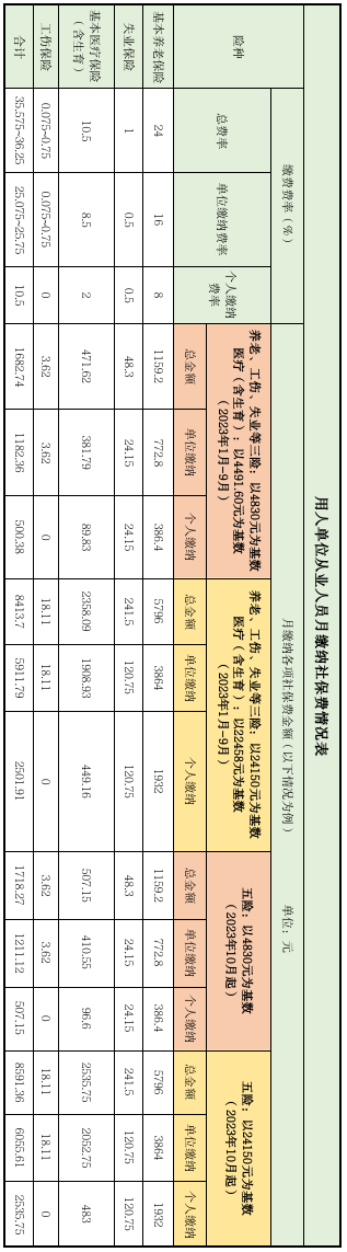 养老、工伤、失业等三险2023年1-12月缴费基数为4830—24150元,