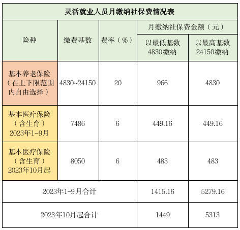 社会保险缴费基数均按从业人员上年度月平均实际工资总额核定,但是最低缴费基数不得低于2022年全省全口径城镇单位就业人员月平均工资的60%(即4830元),最高缴费基数不得高于2022年全省全口径城镇单位就业人员月平均工资的300%(即24150元)。